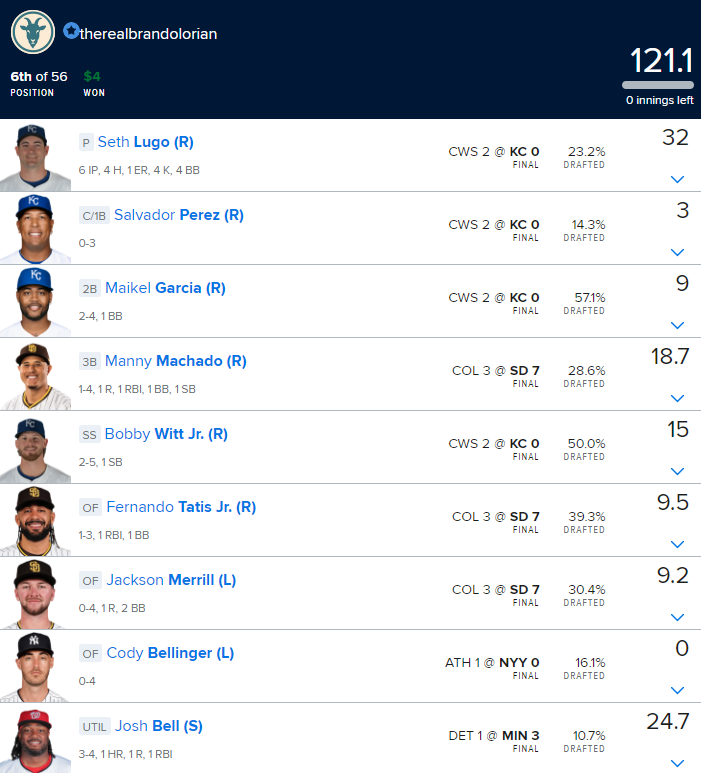 Even with the Royals getting shut out, pairing that stack with Seth Lugo on the mound didn’t burn the lineup. That’s one of those spots that can completely kill you, and it didn’t.